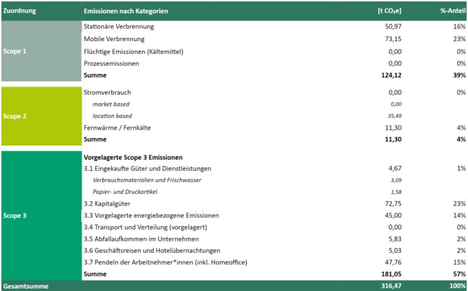 Die Treibhausgasbilanzierung des Unternehmens wurde unter Berücksichtigung der operativen Systemgrenzen in Anlehnung an den Greenhouse Gas Protocol Corporate Standard durchgeführt. Es wurden alle Scope 1 und Scope 2-Kategorien sowie folgende Scope 3-Kategorien miteinbezogen: